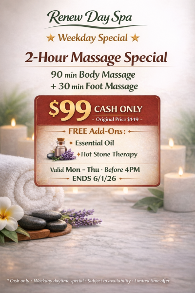 Since 2012, Renew Day Spa has been dedicated to helping our guests relax, recharge, and restore balance. Our professional massage therapists specialize in deep tissue massage, full body massage, and foot reflexology to ease tension, improve circulation, and promote overall wellness.